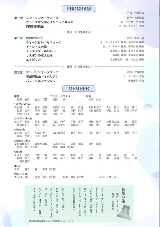 今回は、休憩を挟んでの3部構成のプログラムの中、一曲一曲にその背景やエピソードを添えた素晴らしい司会進行のもと、エトピリカ(情熱大陸のエンディング曲)やパストラルファンタジー(マンドリンオリジナルの名曲)など9曲の演奏に割れんばかりの拍手が贈られました。アンコール曲には「古戦場の秋」が演奏され、最後は、恒例となっている「長崎の鐘」の演奏に合わせて観客の皆さんが大合唱し、会場全体が感動の渦につつまれました。