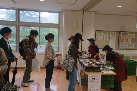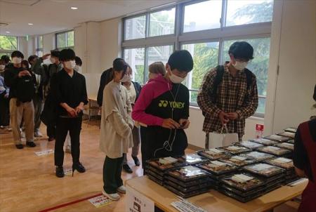 今回は200個の弁当を用意しましたが、2時間で配布完了となりました。当日は生協食堂内及び生協に至る通路まで長い学生の列となる大盛況となり、学生は笑顔で弁当を受け取っていました。