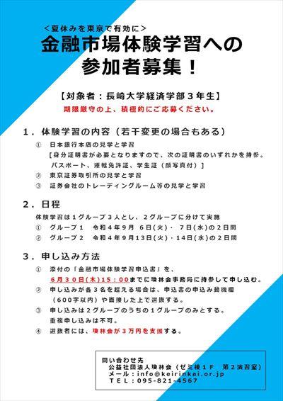 学部3年生を対象に、夏休みを利用して日本銀行本店や東京証券取引所等の東京金融拠点及び証券会社トレーディングルーム等を体験学習する「金融市場体験学習」を3年ぶりに予定しています。
