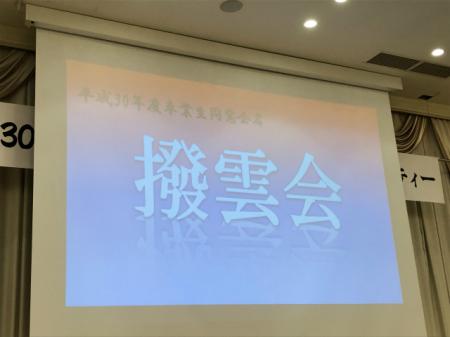 その後、場所をサンプリエールに移し、卒業生、先生、OB等約130名が参加し、卒業記念パーティが実施されました。その際に、今回卒業、終了する学67回生、院23回生の同窓会名がスクリーンで披露されました。同窓会名は「撥雲会」でした。