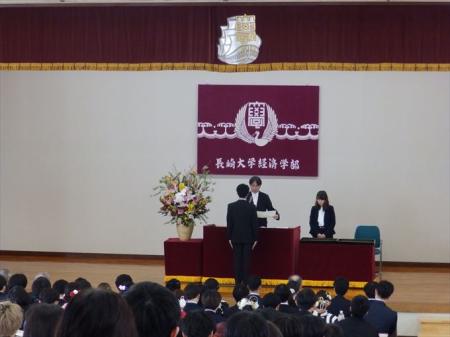 3月25日(火)、令和6年度長崎大学卒業証書・学位授与式がベネックス長崎ブリックホールで執り行われ、その後、経済学部卒業式が片淵町の学部講堂で執り行われました。経済学部卒業式では、卒業生・修了生に対して、宍倉学部長から経済学部で学んだことに誇りをもって歩んでもらいたいなど新たな門出に向けたエールが送られました。