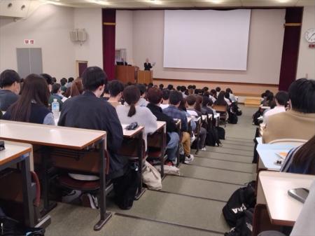 更に、瓊林会の具体的事業活動の説明では、公益事業として学生に対するキャリア教育や就職支援等の事業を積極的に行っているので、今後の学生生活の中で、瓊林会を是非活用していただきたいとの話がされました。新入生は最後まで熱心に聴き入っていました。