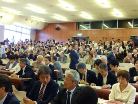 経済学部講堂にて、卒業生・教職員・学生ら約400人が出席して母校の節目を祝いました。
